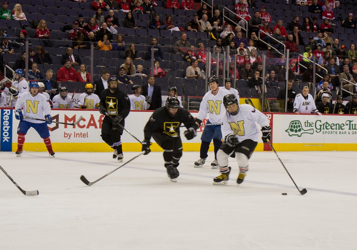 161205-N-BK435-180 WASHINGTON, D.C. (Dec. 5, 2016) Navy hockey player Michael Gierdinz, right, skates over the blue line as an Army hockey player chases in pursuit for the puck at the first ever Army-Navy hockey game. Sailors, Marines, Coast Guardsman, Airmen and Soldiers took to the ice of the Verizon Center where professional NHL team Washing ton Capitals play as part of this year’s Army-Navy festivities. Army won the match 5-3. (U.S. Navy photo by Petty Officer 1st Class Jeremy Starr/Released)