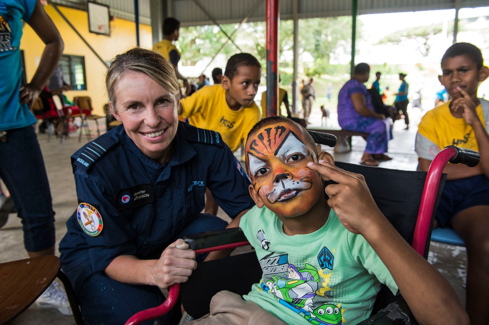 SUVA, Fiji (June 10, 2015) Royal New Zealand Air Force Wing Cmdr. Jennifer Atkinson, Pacific Partnership 2015 Chief of Staff, paints faces of Fijian children at Hilton Special School during Pacific Partnership 2015. Fiji is Mercy’s first mission port of PP15. Pacific Partnership is in its tenth iteration and is the largest annual multilateral humanitarian assistance and disaster relief preparedness mission conducted in the Indo-Asia-Pacific region. While training for crisis conditions, Pacific Partnership missions to date have provided real world medical care to approximately 270,000 patients and veterinary services to more than 38,000 animals. Additionally, the mission has provided official infrastructure development to host nations through more than 180 engineering projects. (U.S. Air Force photo by Senior Airman Peter Reft/RELEASED)