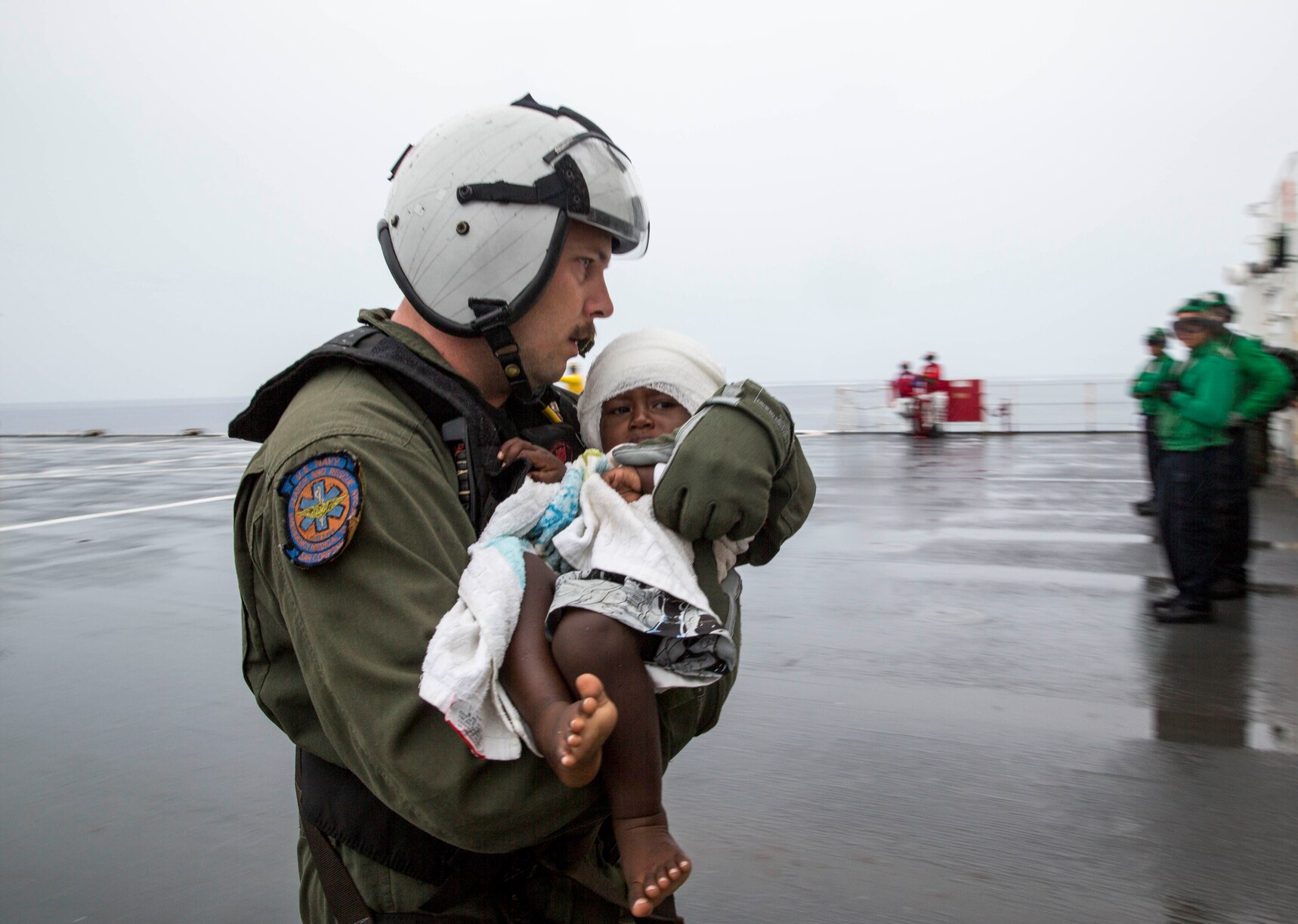 150630-M-DN141-530 ARAWA, Autonomous Region Of Bougainville, Papua New Guinea (June 30, 2015) Hospital Corpsman 1st Class Matthew Hawkins, from West Jordan, Utah, assigned to Helicopter Sea Combat Squadron (HSC) 21, assists an infant aboard the Military Sealift Command hospital ship USNS Mercy (T-AH 19). At the request of the government of Bougainville, Mercy launched one of its helicopters to transport six passengers, including one infant, who swam ashore following their ship sinking off the coast of Carteret Island in Papua New Guinea. The passengers were transported to Mercy and provided medical assistance. According to Navy doctors, all passengers are in good condition. Mercy is in Papua New Guinea as part of Pacific Partnership 2015. (U.S. Marine Corps photo by Sgt. Valerie Eppler/Released)