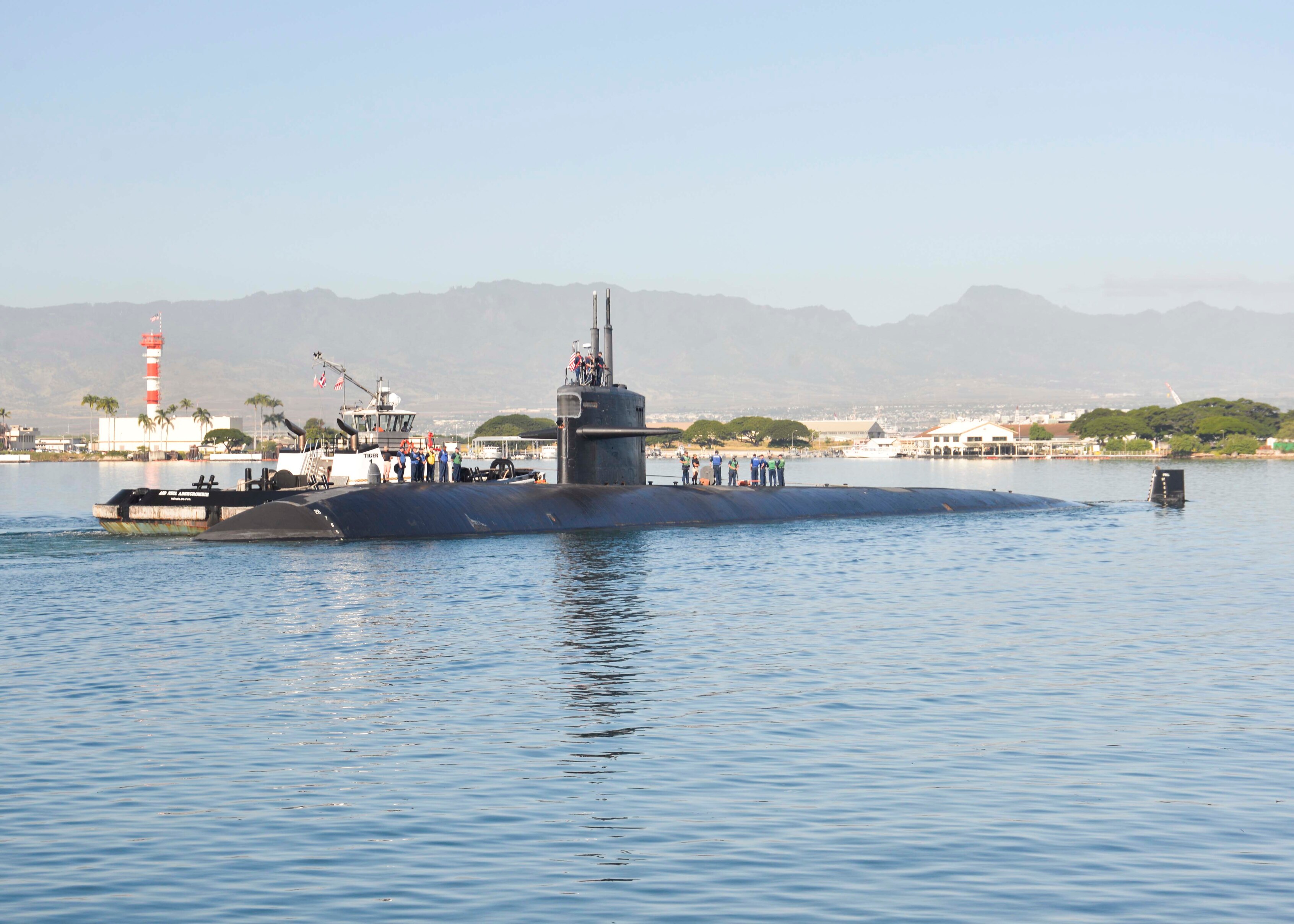 150106-N-DB801-123 PEARL HARBOR (Jan. 6, 2015) The Los Angeles-class attack submarine USS Houston (SSN 713) departs from Joint Base Pearl Harbor-Hickam for routine operations. (U.S. Navy photo by Mass Communication Specialist 1st Class Steven Khor/Released)