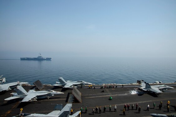150316-N-DJ750-059 ARABIAN GULF (March 16, 2015) An EA-18G Growler from the Cougars of Electronic Attack Squadron (VAQ) 139 launches from the aircraft carrier USS Carl Vinson (CVN 70) while underway in formation with the French navy aircraft carrier Charles de Gaulle (R91). Carl Vinson is deployed in the U.S. 5th Fleet area of responsibility supporting Operation Inherent Resolve, strike operations in Iraq and Syria as directed, maritime security operations, and theater security cooperation efforts in the region. (U.S. Navy photo by Mass Communication Specialist 3rd Class Bryan Jackson/Released)