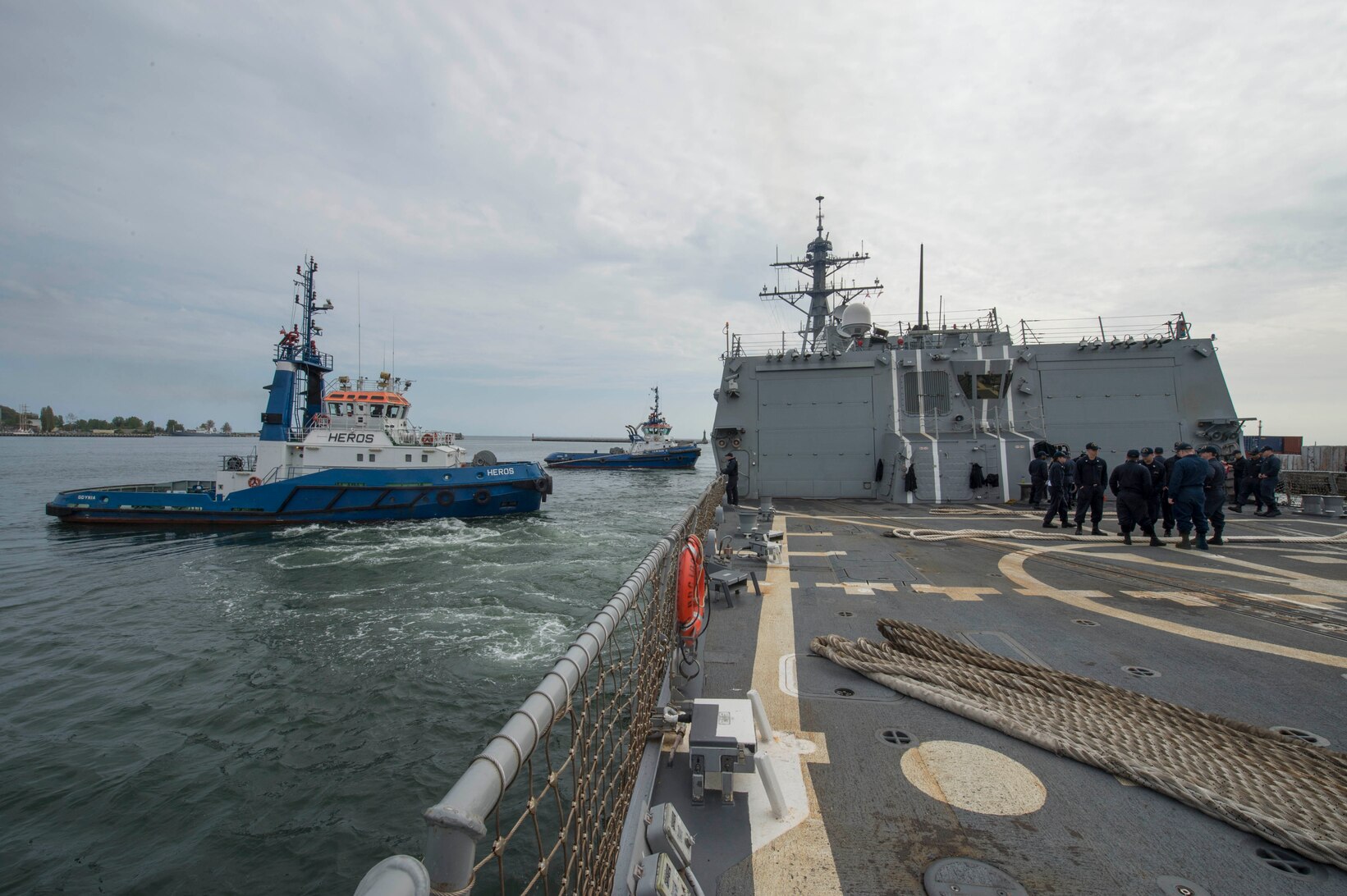 150509-N-ZE250-024 GDYNIA, Poland (May 9, 2015) Tugboats maneuver the guided-missile destroyer USS Jason Dunham (DDG 109) out of port in Gdynia, Poland. Jason Dunham is conducting naval operations in the U.S. 6th Fleet area of operations in support of U.S. national security interests in Europe. (U.S. Navy photo by Mass Communication Specialist 3rd Class Weston Jones/Released)