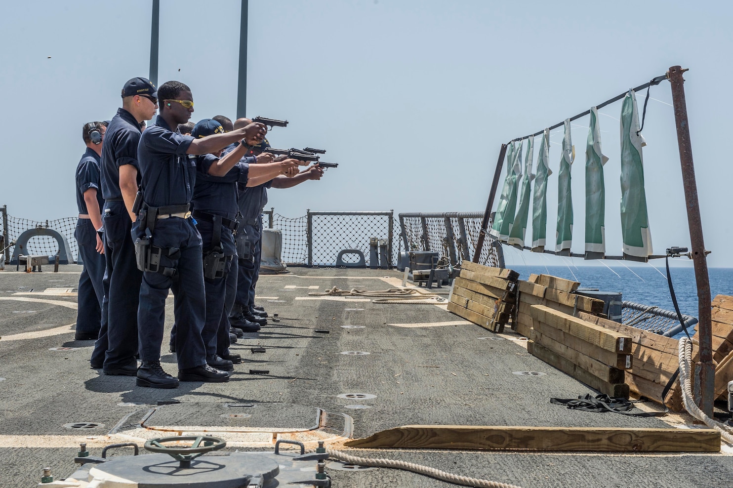 150518-N-XB010-109 MEDITERRANEAN SEA (May 18, 2015) Sailors conduct a small-arms qualification aboard the guided-missile destroyer USS Laboon (DDG 58). Laboon is conducting naval operations in the U.S. 6th Fleet area of operations in support of U.S. national security interests in Europe. (U.S. Navy photo by Mass Communication Specialist 3rd Class Desmond Parks/Released)