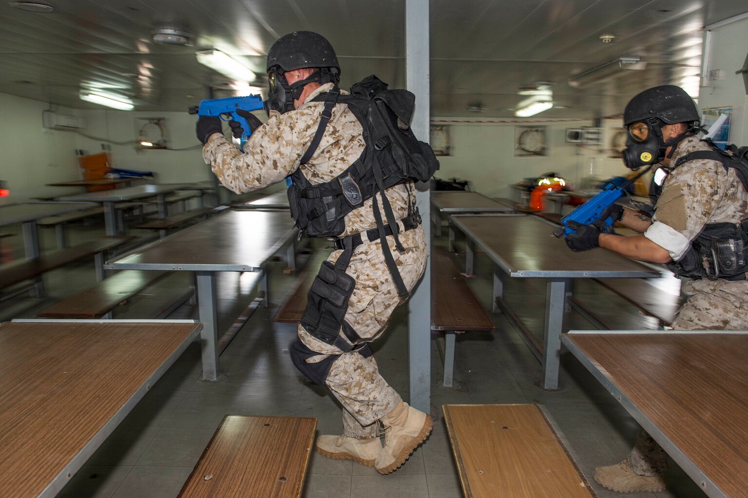 150529-N-XB010-063 SOUDA BAY, Greece (May 29, 2015) Fire Controlman 3rd Class Zacharia Pinkham, left, from Caliente, Nev., and Damage Controlman 2nd Class Elias Acereto, from Tucson, Ariz., secure the mess decks of a ship owned by the NATO Maritime Interdiction Operational Training Center during the final training exercise for the visit, board, search and seizure team from the guided-missile destroyer USS Laboon (DDG 58) in Souda Bay, Greece. Laboon is conducting naval operations in the U.S. 6th Fleet area of operations in support of U.S. national security interests in Europe. (U.S. Navy photo by Mass Communication Specialist 3rd Class Desmond Parks/Released)