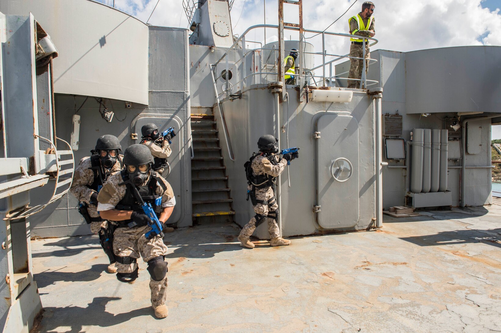 150529-N-XB010-100 SOUDA BAY, Greece (May 29, 2015) Sailors assigned to the guided-missile destroyer USS Laboon (DDG 58) fall into position during a simulated firefight aboard a ship owned by the NATO Maritime Interdiction Operational Training Center during the final training exercise for the visit, board, search and seizure team from the guided-missile destroyer USS Laboon (DDG 58) in Souda Bay, Greece. Laboon is conducting naval operations in the U.S. 6th Fleet area of operations in support of U.S. national security interests in Europe. (U.S. Navy photo by Mass Communication Specialist 3rd Class Desmond Parks/Released)
