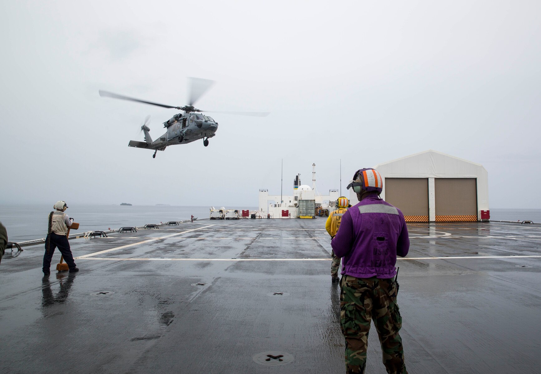 150630-M-DN141-519 ARAWA, Autonomous Region Of Bougainsville, Papua New Guinea (June 30, 2015) An MH-60S Sea Hawk helicopter from Helicopter Sea Combat Squadron (HSC) 21 returns to the Military Sealift Command hospital ship USNS Mercy (T-AH 19) from a mutual aid request with six patients to be treated aboard the ship. The helicopter transported the six passengers, including one infant, from Han Island after a mutual aid request during the second port mission of Pacific Partnership 2015 in Papua New Guinea. Pacific Partnership missions to date have provided medical care to approximately 270,000 patients and veterinary services to more than 38,000 animals. Additionally, the mission has provided critical infrastructure development to host nations through more than 180 engineering projects.(U.S. Marine Corps photo by Sgt. Valerie Eppler/Released)