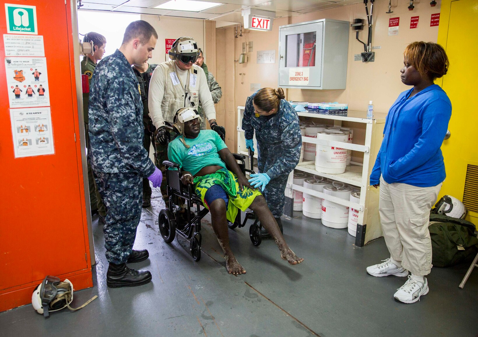150630-M-DN141-555 ARAWA, Autonomous Region Of Bougainville, Papua New Guinea (June 30, 2015) Sailors aboard the the Military Sealift Command hospital ship USNS Mercy (T-AH 19) assist patients during a patient transport mission. At the request of the government of Bougainville, Mercy launched one of its helicopters to transport six passengers, including one infant, who swam ashore following their ship sinking off the coast of Carteret Island in Papua New Guinea. The passengers were transported to Mercy and provided medical assistance. According to Navy doctors, all passengers are in good condition. Mercy is in Papua New Guinea as part of Pacific Partnership 2015. (U.S. Marine Corps photo by Sgt. Valerie Eppler/Released)