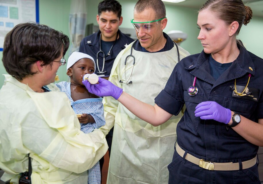 150630-M-DN141-626 ARAWA, Autonomous Region Of Bougainsville, Papua New Guinea (June 30, 2015) Medical personnel calm an infant in the casualty reception area of the Military Sealift Command hospital ship USNS Mercy (T-AH 19). An MH-60S Sea Hawk helicopter from Helicopter Sea Combat Squadron (HSC) 21 picked up six passengers including one infant and returned from Han Island to the ship during the second port mission of Pacific Partnership 2015 in Papua New Guinea. Pacific Partnership is in its tenth iteration and is the largest annual multilateral humanitarian assistance and disaster relief preparedness mission conducted in the Indo-Asia-Pacific region.(U.S. Marine Corps photo by Sgt. Valerie Eppler/Released)