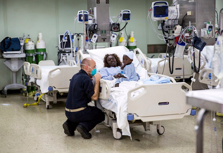 150629-M-DN141-083 ARAWA, Autonomous Region Of Bougainsville, Papua New Guinea (June 30, 2015) Navy Lt. Melvin Turner speaks with patients in the intensive care area of the Military Sealift Command hospital ship USNS Mercy (T-AH 19). An MH-60S Sea Hawk helicopter from Helicopter Sea Combat Squadron (HSC) 21 picked up six passengers including one infant and returned from Han Island to the ship during the second port mission of Pacific Partnership 2015 in Papua New Guinea. Pacific Partnership is in its tenth iteration and is the largest annual multilateral humanitarian assistance and disaster relief preparedness mission conducted in the Indo-Asia-Pacific region. (U.S. Marine Corps photo by Sgt. Valerie Eppler/Released)