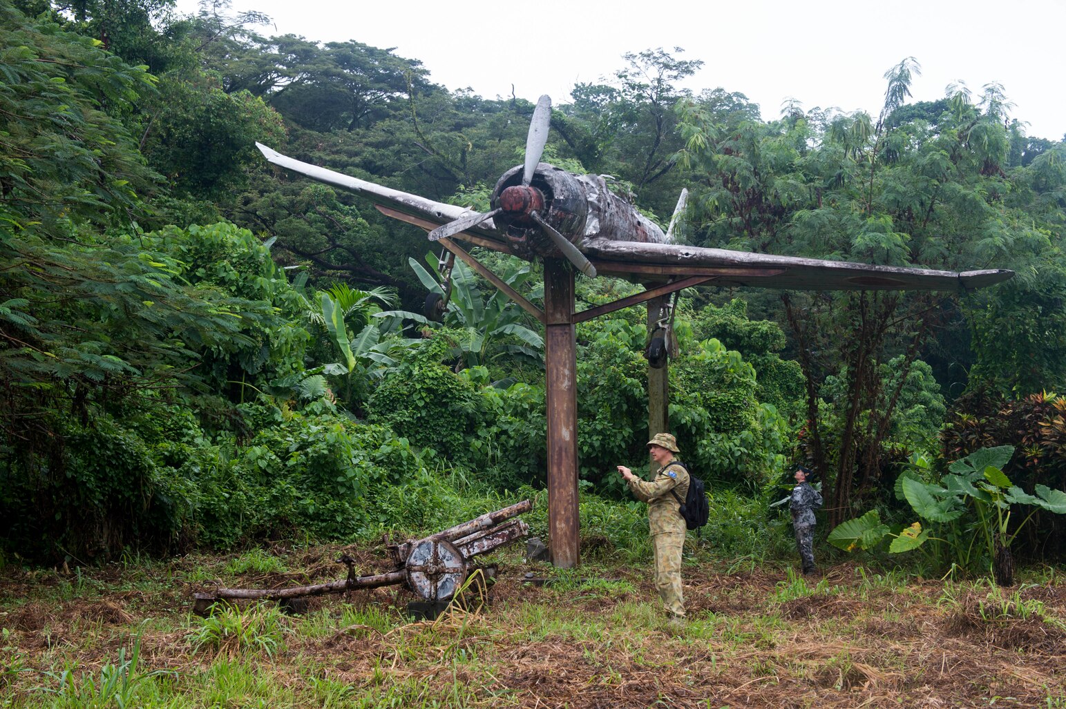 150630-N-BK290-257 ARAWA, Autonomous Region of Bougainville, Papua New Guinea (June 30, 2015) Australian Air Force Sgt. John Baker takes a photo of a World War II-era canon at the monument site of Chief Barosi, an Arawan who assisted allied forces during World War II. Australian Defence Force personnel and Sailors helped clean the monument site as part of a community service project during Pacific Partnership 2015. Pacific Partnership is in its tenth iteration and is the largest annual multilateral humanitarian assistance and disaster relief preparedness mission conducted in the Indo-Asia-Pacific region. Pacific Partnership missions to date have provided medical care to approximately 270,000 patients and veterinary service to more than 38,000 animals. Critical infrastructure development has been supported in host nations during more than 180 engineering projects. (U.S. Navy photo by Chief Mass Communication Specialist Christopher E. Tucker/Released)