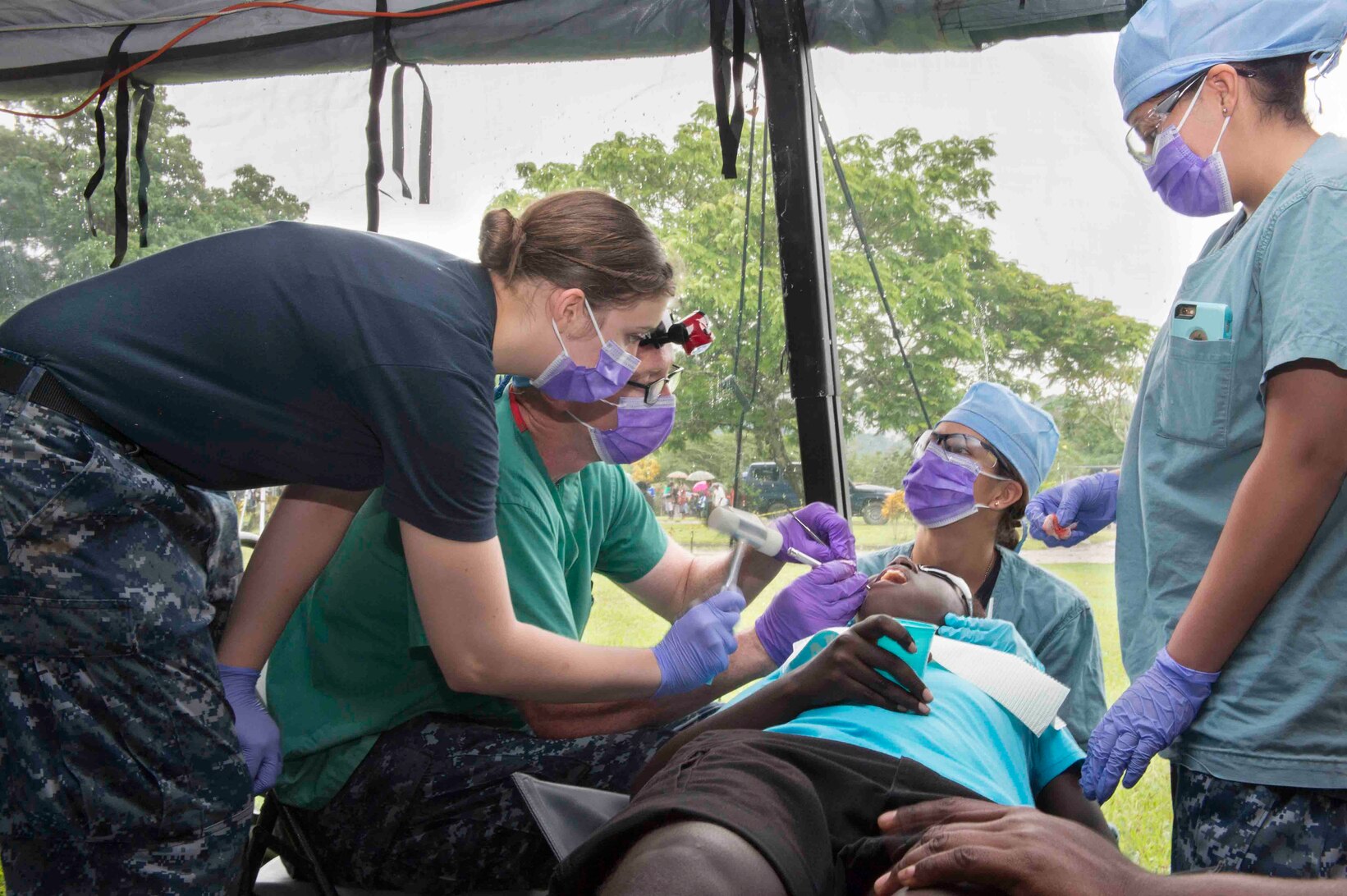 150630-N-CF750-039 ARAWA, Autonomous Region of Bougainville, Papua New Guinea (June 30, 2015) Hospitalman Lyric Peterson, from Austin, Texas, taps a chisel held by Capt. John Moon, from Oak Harbor, Wash., as Lt. Danielle Berkowitz, seated, from Smithtown, N.Y., and Corpsman 3rd Class Stephanie Caicedo, from Jacksonville, Fla., attend during a surgical tooth extraction during a Pacific Partnership 2015 community health event in Arawa, Papua New Guinea. The Military Sealift Command hospital ship USNS Mercy (T-AH 19) is in Papua New Guinea for its second mission port of Pacific Partnership 2015. Pacific Partnership is in its tenth iteration and is the largest annual multilateral humanitarian assistance and disaster relief preparedness mission conducted in the Indo-Asia-Pacific region. Pacific Partnership missions to date have provided medical care to approximately 270,000 patients and veterinary services to more than 38,000 animals. Critical infrastructure development has been supported in host nations during more than 180 engineering projects. (U.S. Navy photo by Chief Mass Communication Specialist Greg Badger/Released)