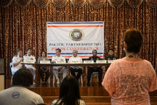 150720-N-TQ272-455 ROXAS CITY, Philippines (July 20, 2015) Capt. Melanie Merrick, commanding officer of the medial treatment facility aboard the Military Sealift Command hospital ship Mercy (T-AH 19), answers questions during a press conference as part of Pacific Partnership 2015. Mercy is in the Philippines for its third mission port of Pacific Partnership 2015. Pacific Partnership is in its 10th iteration and is the largest annual multilateral humanitarian assistance and disaster relief preparedness mission conducted in the Indo-Asia-Pacific region. (U.S. Navy photo by Mass Communication Specialist 2nd Class Mark El-Rayes/Released)