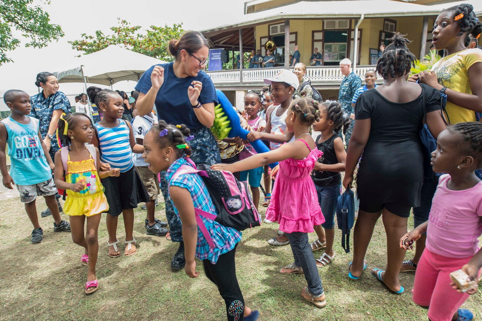 150730-N-PD309-153 ROSEAU, Dominica (July 30, 2015) Sailors dance with children while the U.S. Fleet Forces Band ensemble, Uncharted Waters, plays at a community service event at Roseau Public Library during Continuing Promise 2015. Continuing Promise is a U.S. Southern Command-sponsored and U.S. Naval Forces Southern Command/U.S. 4th Fleet-conducted deployment to conduct civil-military operations including humanitarian-civil assistance, subject matter expert exchanges, medical, dental, veterinary and engineering support and disaster response to partner nations and to show U.S. support and commitment to Central and South America and the Caribbean. (U.S. Navy photo by Mass Communication Specialist 3rd Class Deven Leigh Ellis/Released)