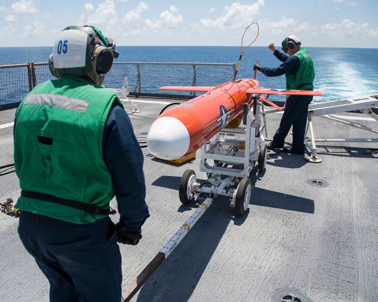 150730-N-SU278-183 PACIFIC OCEAN (July 30, 2015) Aviation Structural Mechanic 2nd Class Ramon McDuffie, left, and Machinery Repairman 2nd Class Sean Walters position a BQM-74E target drone for maintenance on the flight deck of the amphibious dock landing ship USS Germantown (LSD 42). Germantown is deployed to the U.S. 7th Fleet area of responsibility as part of the ship's scheduled summer patrol. (U.S. Navy photo by Mass Communication Specialist 2nd Class Will Gaskill/Released)