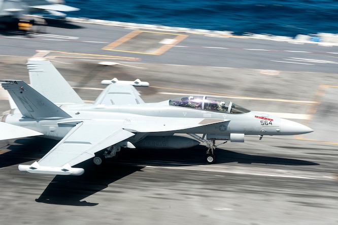 150809-N-MU551-067 ATLANTIC OCEAN (Aug. 9, 2015) An EA-18G Growler assigned to the Vikings of Strike Fighter Squadron (VAQ) 129 lands on the flight deck of the aircraft carrier USS Harry S. Truman (CVN 75). Harry S. Truman is underway conducting carrier qualifications in preparation for its upcoming deployment. (U.S. Navy photo by Mass Communication Specialist 3rd Class M. M. Gillan/Released)