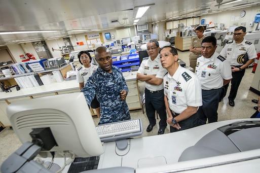 150810-N-TQ272-303 SUBIC BAY, Philippines (Aug. 10, 2015) Hospital Corpsman 1st Class Emmanual Aligwekwe, assigned to the Military Sealift Command hospital ship USNS Mercy (T-AH 19), explains laboratory procedures to Brig. Gen. Joselito Payumo Avancena, surgeon general of the Armed Forces of the Philippines, during Pacific Partnership 2015. Mercy is in the Philippines for its third mission port of Pacific Partnership 2015. Now in its 10th year, Pacific Partnership is the largest annual multilateral humanitarian assistance and disaster relief preparedness mission conducted in the Indo-Asia-Pacific region. (U.S. Navy photo by Mass Communication Specialist 2nd Class Mark El-Rayes/Released)