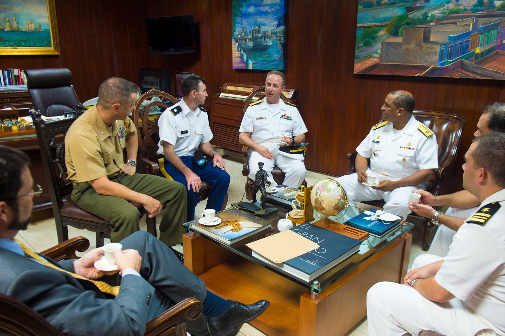 150822-N-YM856-144 SANTO DOMINGO, Dominican Republic (Aug. 22, 2015) Rear Admiral Jon Matheson, center, deputy commander of U.S. Naval Forces Southern Command/U.S. 4th Fleet, speaks with members of the Armada de la Repulica Dominicana during a closing ceremony at Naval Base 27 de Febrero in support of Continuing Promise 2015. Continuing Promise is a U.S. Southern Command-sponsored and U.S. Naval Forces Southern Command/U.S. 4th Fleet-conducted deployment to conduct civil-military operations including humanitarian-civil assistance, subject matter expert exchanges, medical, dental, veterinary and engineering support and disaster response to partner nations and to show U.S. support and commitment to Central and South America and the Caribbean. (U.S. Navy photo by Mass Communication Specialist 2nd Class Brittney Cannady/Released)