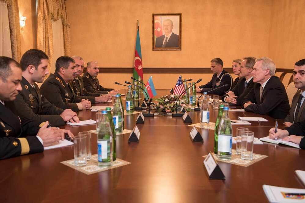151107-N-LV331-004 BAKU, Azerbaijan (Nov. 7, 2015) Secretary of the Navy (SECNAV) Ray Mabus meets with Col. Gen. Zakhir Hasanov, Azerbaijan Minister of Defense, to discuss the status of the relationship between the military forces of the United States and Azerbaijan. Mabus is in the area as part of a multinational trip to the U.S. Southern, Africa, Central and European command areas of responsibility to meet Sailors, Marines, and military and government leaders. (U.S. Navy photo by Mass Communication Specialist 2nd Class Armando Gonzales/Released)