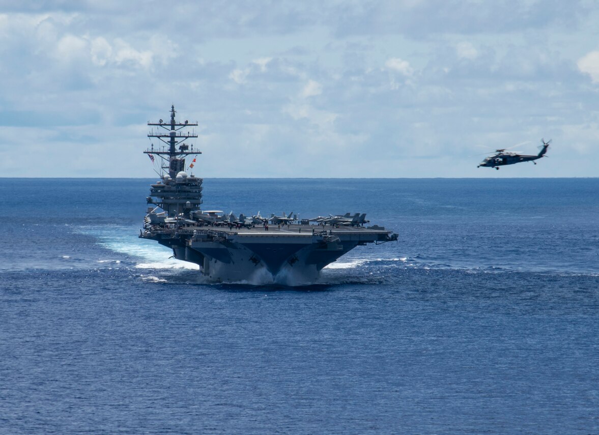 200721-N-DL524-1270 PHILIPPINE SEA (July 21, 2020) An MH-60S Sea Hawk helicopter attached to the Golden Eagles of Helicopter Sea Combat Squadron (HSC) 12 approaches the flight deck of the Navy’s only forward deployed aircraft carrier USS Ronald Reagan (CVN 76) during a trilateral exercise. Trilateral exercises between the Japan Maritime Self-Defense Force, Australian Defense Force and U.S. Navy support shared goals of peace and stability while enhancing regional security and the right of all nations to trade, communicate, and choose their destiny in a free and open Indo-Pacific region. (U.S. Navy photo by Mass Communication Specialist 3rd Class Erica Bechard/Released)