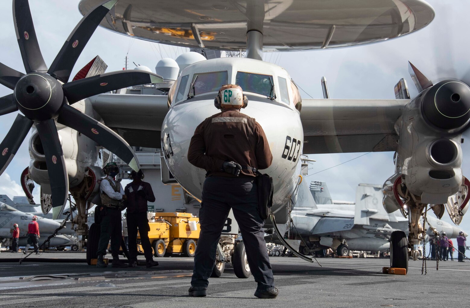 PHILIPPINE SEA (July 26, 2020) Airman Joey Caballero, from New York, signals to an E-2D Hawkeye attached to the Tiger Tails of Airborne Command and Control Squadron (VAW) 125, during pre-flight checks on the flight deck of the Navy’s only forward-deployed aircraft carrier USS Ronald Reagan (CVN 76). Ronald Reagan, the flagship of Carrier Strike Group 5, provides a combat-ready force that protects and defends the United States, as well as the collective maritime interests of its allies and partners in the Indo-Pacific region. (U.S. Navy photo by Mass Communication Specialist 3rd Class Erica Bechard)