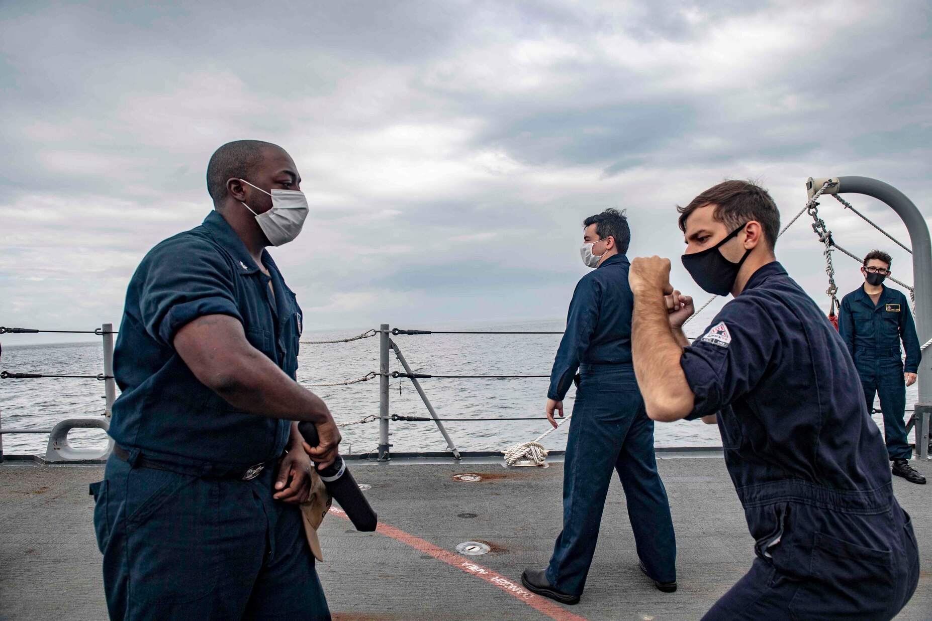 EAST CHINA SEA (July 25, 2020) Operations Specialist 3rd Class Nicholas DuBose, from Louisville, Ky., instructs Sailors on how to properly block an attack during an anti-terrorism force protection course aboard the Ticonderoga-class guided-missile cruiser USS Shiloh (CG 67). Shiloh is forward-deployed to the U.S. 7th Fleet area of operations in support of security and stability in the Indo-Pacific region. (U.S. Navy photo by Mass Communication Specialist 3rd Class Isaac Maxwell)
