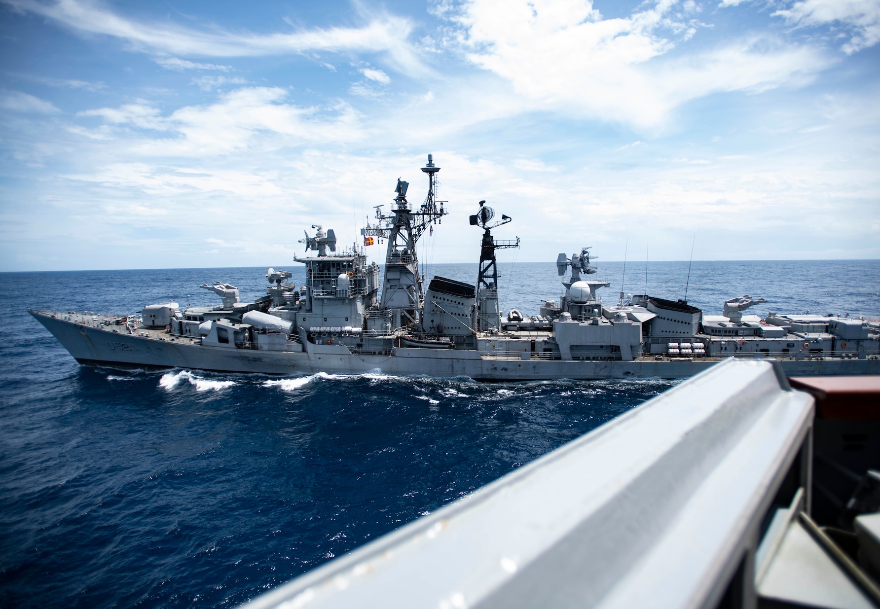 INDIAN OCEAN (July 21, 2020) The Arleigh Burke-class guided-missile destroyer USS Ralph Johnson (DDG 114) steams alongside the Indian navy Rajput-class destroyer INS Rana (D52) in the Indian Ocean. The Nimitz Carrier Strike Group, consisting of flagship USS Nimitz (CVN 68), the Ticonderoga-class guided-missile cruiser USS Princeton (CG 59), and Arleigh Burke-class guided-missile destroyers USS Sterett (DDG 104) and Ralph Johnson, along with Indian Navy ships Rana, Sahyadri, Shivalik, and Kamorta, are currently participating in a cooperative deployment in the Indian Ocean. (U.S. Navy photo by Mass Communication Specialist 3rd Class Anthony Collier)