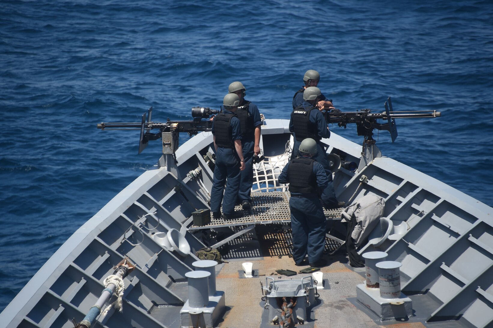 ATLANTIC OCEAN (July 28, 2020) The small caliber action team assigned to the Ticonderoga-class guided-missile cruiser USS Philippine Sea (CG 58) man the weapons on the ship. Philippine Sea is underway as part of an maritime security operations training exercise. (U.S. Navy photo by Mass Communication Specialist 2nd Class Indra Beaufort)