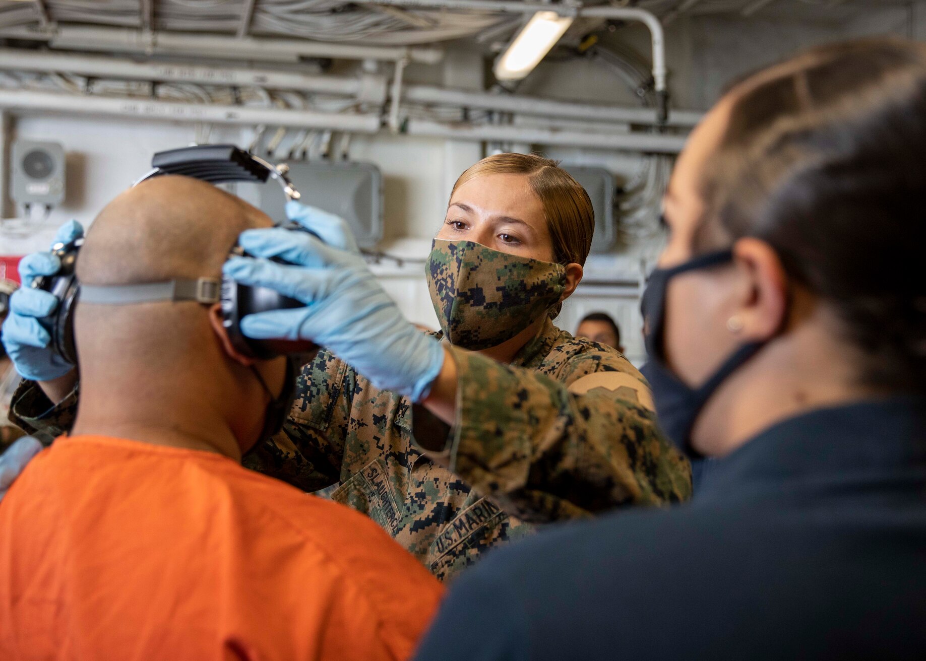 PACIFIC OCEAN (July 28, 2020) Lance Cpl. McKenzie Slaughter-Clark, a Marine police officer attached to the 15th Marine Expeditionary Unit, places personal protective equipment on a simulated detainee during a security drill aboard the amphibious assault ship USS Makin Island (LHD 8). The equipment is protocol for detainees to board the ship. Makin Island, homeported in San Diego, is conducting routine operations in the eastern Pacific. (U.S. Navy photo by Mass Communication Specialist Seaman Nadia Lund)