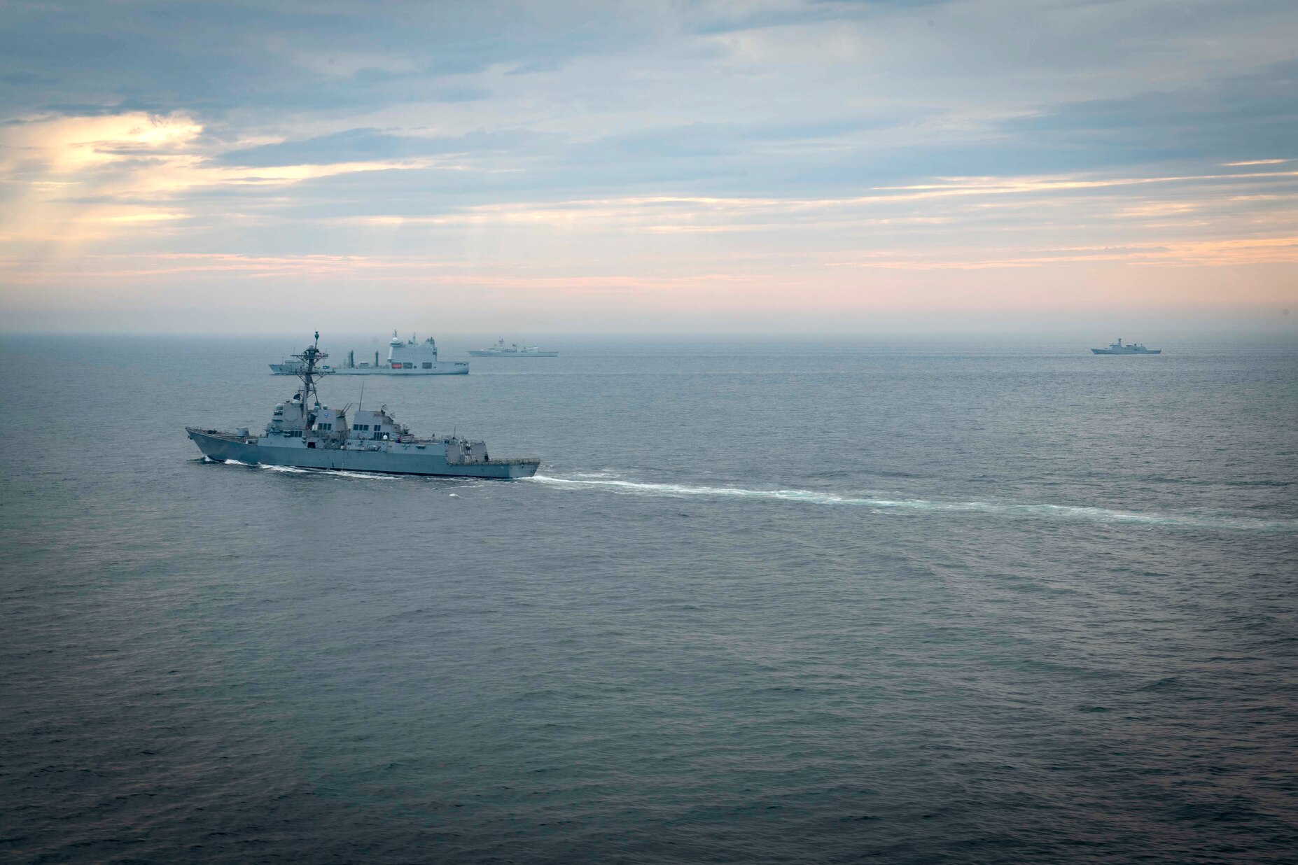 SEA OF LABRADOR (Aug. 9, 2020) The Arleigh Burke-class guided-missile destroyer USS Thomas Hudner (DDG 116) transits in formation with ships participating in Operation Nanook from the U.S. Coast Guard, Royal Canadian Navy, Royal Danish Navy and French Navy., Aug. 9, 2020. Thomas Hudner participates in Canadian Operation Nanook alongside U.S. Coast Guard, Canadian, French, and Danish Allies to enhance their Arctic capabilities, and meet the requirements outlined in each nation's respective defense policies. (U.S. Navy photo by Mass Communication Specialist Sara Eshleman)