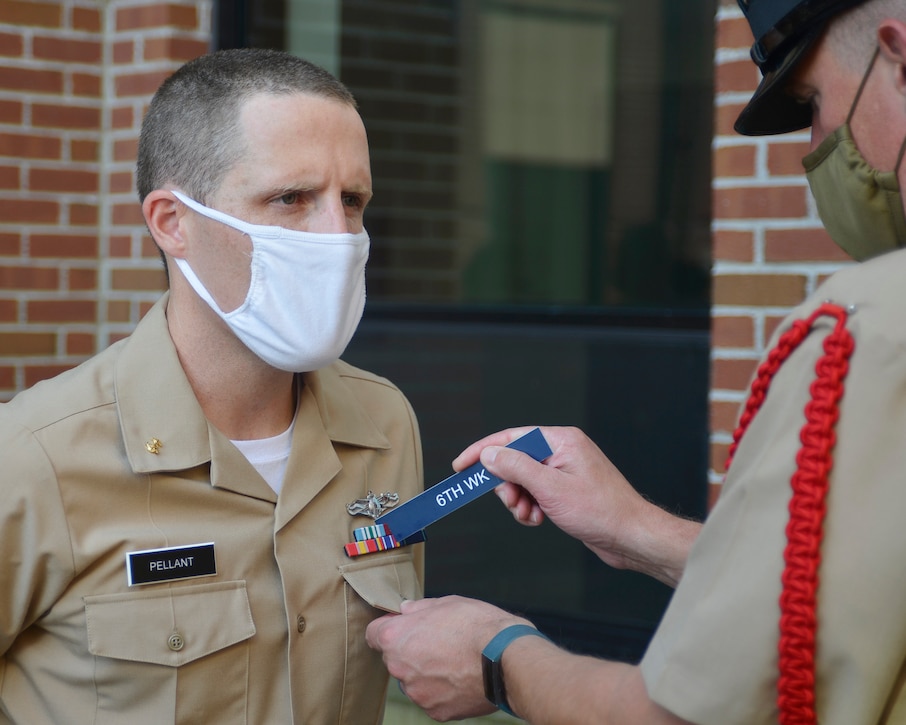 NEWPORT, R.I. (Aug. 11, 2020) An Officer Candidate School (OCS) student at Officer Training Command Newport (OTCN), Rhode Island, maintains military bearing while a Recruit Division Commander (RDC) measures his warfare pin and award decoration placement during the sixth week inspection. The sixth week inspection evaluates confidence, discipline and attention to detail, while ensuring uniforms are worn in accordance with Navy uniform regulations. OCS develops civilians and fleet Sailors into newly commissioned officers morally, mentally, and physically and imbues them with the highest ideals of honor, courage and commitment for service in the fleet as Naval officers. (U.S. Navy photo by Cozart Townes)
