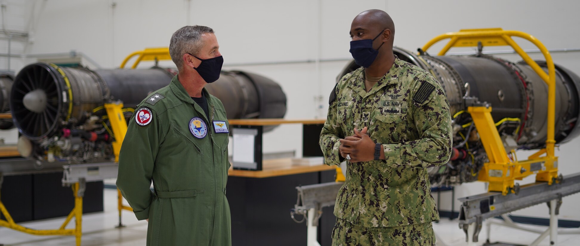 PENSACOLA, Fla. (Aug. 6, 2020) Rear Adm. Pete Garvin, commander, Naval Education and Training Command, left, listens as Petty Officer 1st Class Kyle McDaniel, an instructor at naval Air Technical Training Center, explains how students are taught in the center's engine laboratory. (U.S. Navy photo by Lt. Ian Loomis)