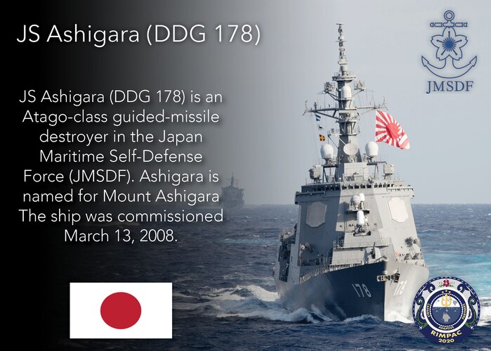SAN DIEGO (Aug. 17, 2020) An infographic highlighting Japan Maritime Self Defense Force (JMSDF) guided-missile destroyer JS Ashigara (DDG 178) participating in Rim of the Pacific 2020 (RIMPAC) exercise. Ten nations, 22 ships, one submarine, and more than 5,300 personnel are participating in RIMPAC from August 17 to 31 at sea around the Hawaiian Islands. RIMPAC is a biennial exercise designed to foster and sustain cooperative relationships, critical to ensuring the safety of sea lanes and security in support of a free and open Indo-Pacific region. The exercise is a unique training platform designed to enhance interoperability and strategic maritime partnerships. RIMPAC 2020 is the 27th exercise in the series that began in 1971. (U.S. Navy graphic illustration by Mass Communication Specialist 2nd Class Natalie M. Byers)