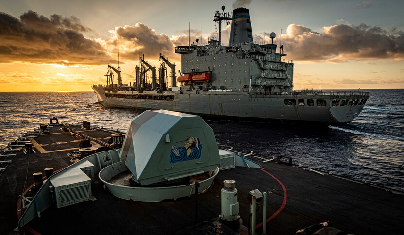 PACIFIC OCEAN (Aug. 16, 2020) The Royal Canadian Navy frigate HMCS Regina (FFH 334) moves into position to conduct a replenishment-at-sea with the U.S. Military Sealift Command fleet replenishment oiler USNS Henry J. Kaiser (T-AO 187). Ten nations, 22 ships, one submarine, and more than 5,300 personnel are participating in Exercise Rim of the Pacific (RIMPAC) from August 17 to 31 at sea around the Hawaiian Islands. RIMPAC is a biennial exercise designed to foster and sustain cooperative relationships, critical to ensuring the safety of sea lanes and security in support of a free and open Indo-Pacific region. The exercise is a unique training platform designed to enhance interoperability and strategic maritime partnerships. RIMPAC 2020 is the 27th exercise in the series that began in 1971. (Royal Canadian Navy photo by MS Dan Bard)
