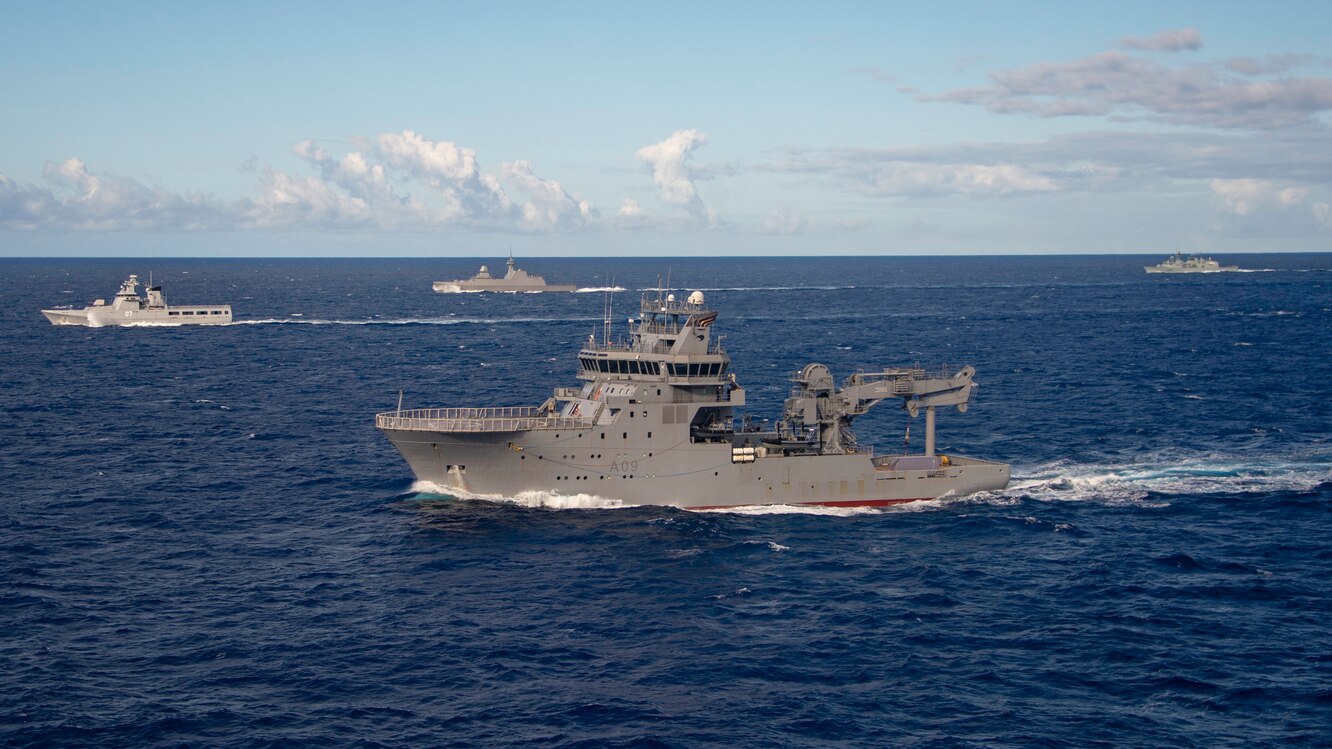 PACIFIC OCEAN (Aug.18, 2020) Royal New Zealand Navy ship HMNZS Manawanui (A09) maneuvers during a division tactics exercise with Royal Brunei Navy Darussalam-class offshore patrol vessel KDB Darulehsan (OPV 07), Republic of Singapore Navy Formidable-class frigate RSS Supreme (FFG 73) and Royal Canadian Navy ship HMCS Winnipeg (FFH 338) during Exercise Rim of the Pacific (RIMPAC) 2020. Ten nations, 22 ships, 1 submarine, and more than 5,300 personnel are participating in RIMPAC from Aug. 17 to 31 at sea around the Hawaiian Islands. RIMPAC is a biennial exercise designed to foster and sustain cooperative relationships, critical to ensuring the safety of sea lanes and security in support of a free and open Indo-Pacific region. The exercise is a unique training platform designed to enhance interoperability and strategic maritime partnerships. RIMPAC 2020 is the 27th exercise in the series that began in 1971. (U.S. Navy photo by Mass Communication Specialist 3rd Class Wesley Richardson)