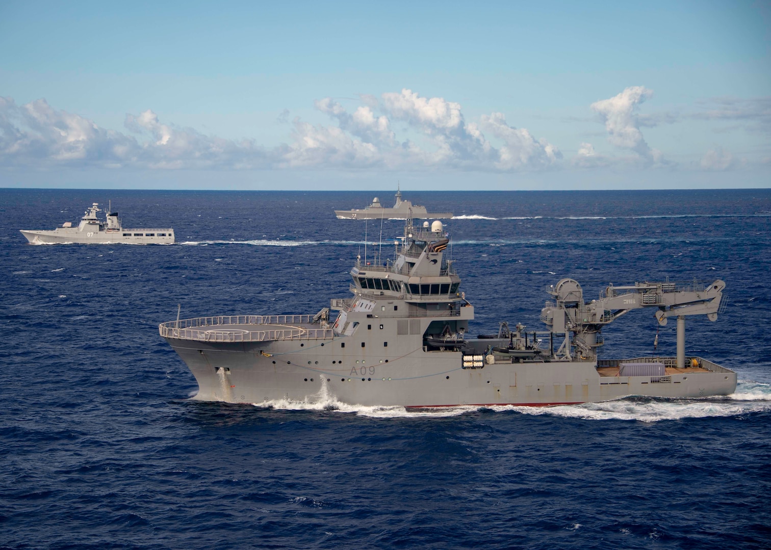 PACIFIC OCEAN (Aug. 18, 2020) Royal New Zealand Navy ship HMNZS Manawanui (A09) maneuvers during a division tactics exercise with Royal Brunei Navy Darussalam-class offshore patrol vessel KDB Darulehsan (OPV 07) and Republic of Singapore Navy Formidable-class frigate RSS Supreme (FFG 73) during Exercise Rim of the Pacific (RIMPAC) 2020. Ten nations, 22 ships, 1 submarine, and more than 5,300 personnel are participating in RIMPAC from Aug. 17 to 31 at sea around the Hawaiian Islands. RIMPAC is a biennial exercise designed to foster and sustain cooperative relationships, critical to ensuring the safety of sea lanes and security in support of a free and open Indo-Pacific region. The exercise is a unique training platform designed to enhance interoperability and strategic maritime partnerships. RIMPAC 2020 is the 27th exercise in the series that began in 1971. (U.S. Navy photo by Mass Communication Specialist 3rd Class Wesley Richardson)