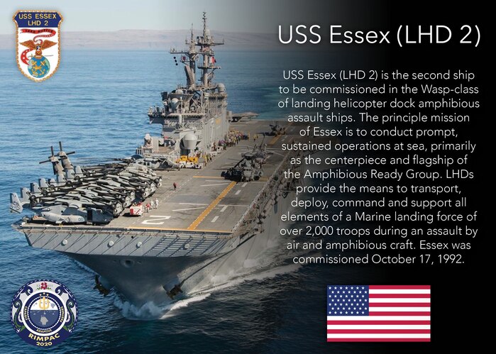 SAN DIEGO (Aug. 20, 2020) An infographic highlighting the U.S. Navy Wasp-class landing helicopter dock amphibious assault ship USS Essex (LHD 2) participating in Exercise Rim of the Pacific (RIMPAC) 2020. Ten nations, 22 ships, one submarine, and more than 5,300 personnel are participating in RIMPAC from August 17 to 31 at sea around the Hawaiian Islands. RIMPAC is a biennial exercise designed to foster and sustain cooperative relationships, critical to ensuring the safety of sea lanes and security in support of a free and open Indo-Pacific region. The exercise is a unique training platform designed to enhance interoperability and strategic maritime partnerships. RIMPAC 2020 is the 27th exercise in the series that began in 1971. (U.S. Navy graphic illustration by Mass Communication Specialist 2nd Class Natalie M. Byers)
