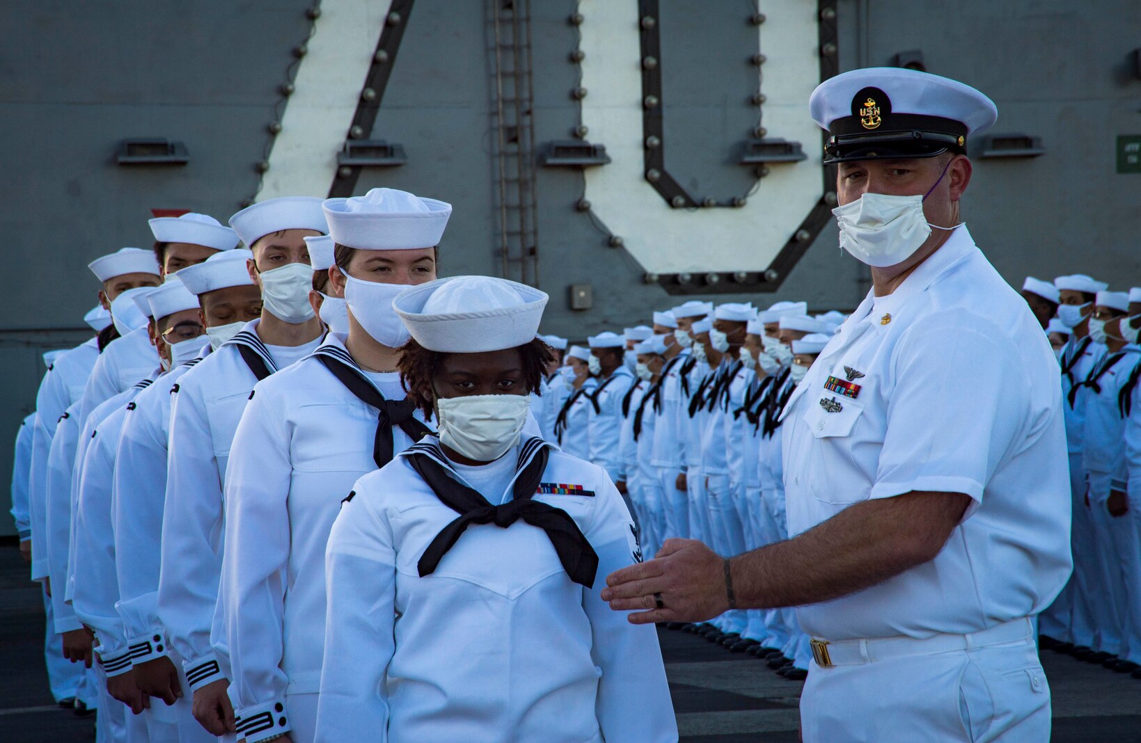BREMERTON, Wash. (Aug. 23, 2020) Sailors assigned to Nimitz class nuclear aircraft carrier USS Carl Vinson (CVN 70) begin to man the rails on the flight deck of the ship. Vinson departs Naval Base Kitsap�Bremerton after completing a 17-month regularly scheduled docking plan incremental availability (DPIA). During the DPIA, the ship underwent a complete restoration and a system retrofit to accommodate the F-35C Lightning II Joint Strike Fighter mission capabilities. (U.S. Navy photo by Mass Communication Specialist 3rd Class Nicholas R. Carter)