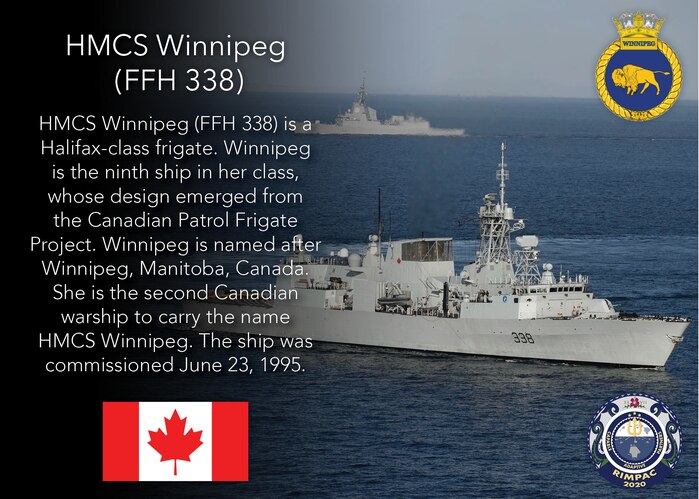 SAN DIEGO (Aug. 23, 2020) An infographic highlighting the Royal Canadian Navy ship HMCS Winnipeg (FFH 338) participation in Exercise Rim of the Pacific 2020 (RIMPAC). Ten nations, 22 ships, one submarine, and more than 5,300 personnel are participating in RIMPAC from August 17 to 31 at sea around the Hawaiian Islands. RIMPAC is a biennial exercise designed to foster and sustain cooperative relationships, critical to ensuring the safety of sea lanes and security in support of a free and open Indo-Pacific region. The exercise is a unique training platform designed to enhance interoperability and strategic maritime partnerships. RIMPAC 2020 is the 27th exercise in the series that began in 1971. (U.S. Navy graphic illustration by Mass Communication Specialist 2nd Class Natalie M. Byers)