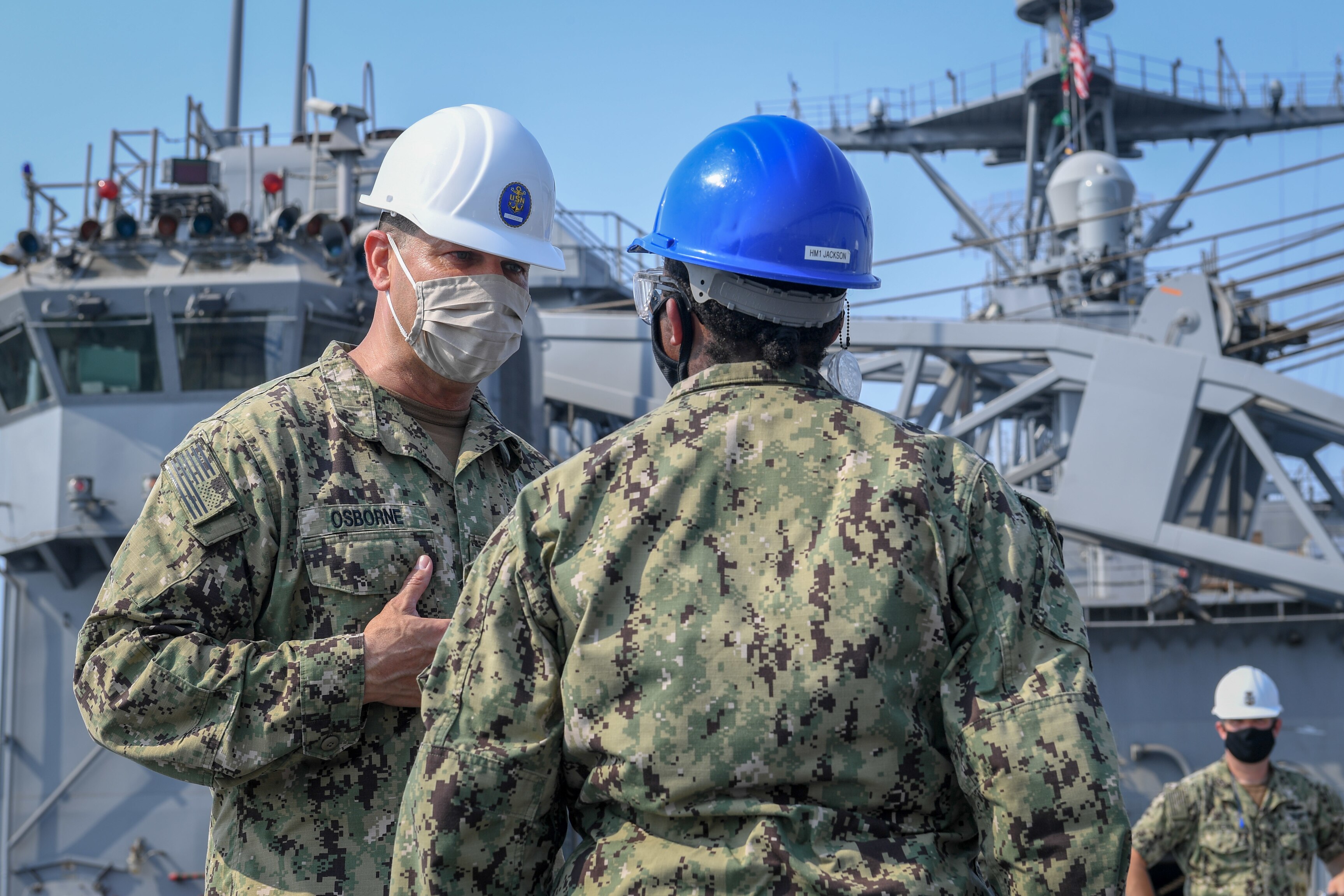 SAN DIEGO (Aug. 20, 2020) Force Master Chief James Osborne, Commander, Naval Surface Force U.S. Pacific Fleet, talks to a Sailor aboard dock landing ship USS Rushmore (LSD 47). Osborne toured Rushmore with Vice Adm. Roy Kitchener, Commander, Naval Surface Force U.S. Pacific Fleet, where they evaluated the ship�s current state of readiness. (U.S. Navy photo by Mass Communication Specialist 2nd Class Alex Millar)