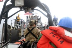 PACIFIC OCEAN (Aug. 24, 2020) Sailors and Coast Guardsman aboard the Cyclone-class coastal patrol ship USS Tornado (PC 14) bid farewell to Lt. Cmdr. Matthew Shepard, a chaplain, as he is transferred to the guided-missile destroyer USS Pinckney (DDG 91). Tornado is deployed to the U.S. Southern Command area of responsibility to support Joint Interagency Task Force South's mission, which includes counter illicit drug trafficking in the Caribbean and eastern Pacific. (U.S. Navy photo by Operations Specialist 2nd class Derrol Johnson)