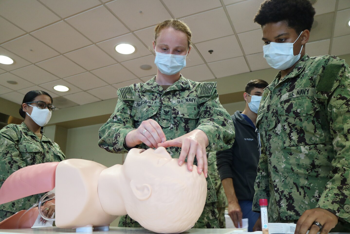 NAPLES, Italy (Aug. 25, 2020) Hospital Corpsman 3rd Class Anne Francavilla, practices her skills at the COVID-19 nasal swabbing station at the Navy Medicine Readiness and Training Command semi-annual skills fair. (U.S. Navy photo by Christina Clarke)