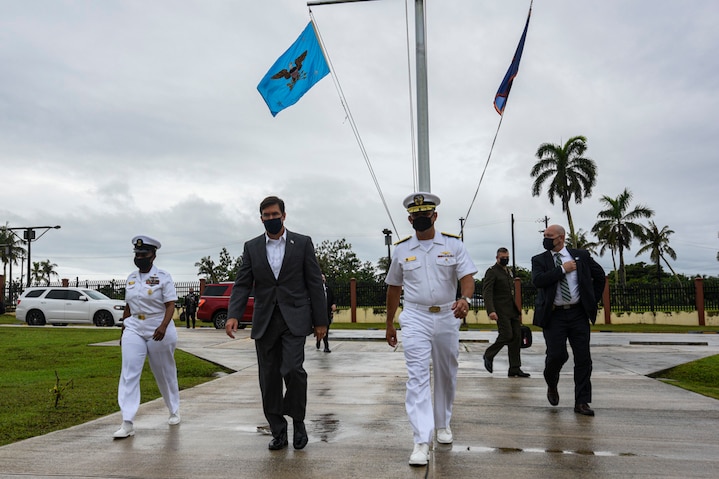 ASAN, Guam (Aug. 29, 2020) Secretary of Defense Dr. Mark T. Esper is escorted by Rear Adm. John Menoni, commander of Joint Region Marianas, and Command Master Chief Lisa Tisdale, Joint Region Marianas command master chief, into Joint Region Marianas headquarters. The visit is part of a key leader engagement to demonstrate joint force combat readiness and resilience during a global pandemic. (U.S. Navy photo by Mass Communication Specialist 3rd Class MacAdam Kane Weissman)
