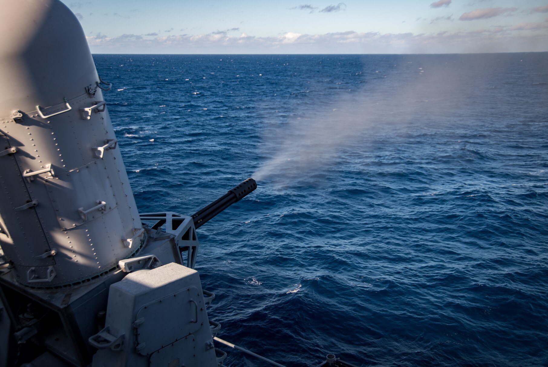 PACIFIC OCEAN (Aug. 24, 2020) A close-in weapon system (CIWS) fires during a pre-action aim calibration fire exercise aboard the Nimitz-class aircraft carrier USS Carl Vinson (CVN 70). Carl Vinson is en route to San Diego after completing a 17-month scheduled docking planned incremental availability in Bremerton, Washington, during which the ship underwent a complete restoration and a system retrofit to accommodate F-35C Lightning II Joint Strike Fighter mission capabilities. (U.S. Navy photo by Mass Communication Specialist Seaman Aaron T. Smith)