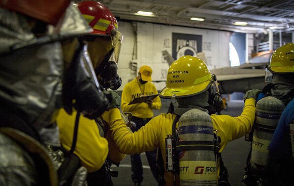 PACIFIC OCEAN (Aug. 28, 2020) Sailors assigned to the Nimitz-class aircraft carrier USS Carl Vinson (CVN 70) participate in an aircraft fire drill in the ship’s hangar bay. Carl Vinson is en route to San Diego after completing a 17-month scheduled docking planned incremental availability in Bremerton, Washington, during which the ship underwent a complete restoration and a system retrofit to accommodate F-35C Lightning II Joint Strike Fighter mission capabilities. (U.S. Navy photo by Mass Communication Specialist 3rd Class Ellen E. Sharkey)