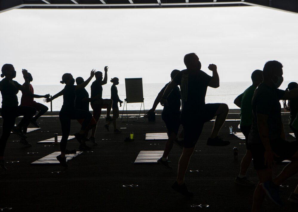 PACIFIC OCEAN (Aug. 29, 2020) Sailors assigned to Nimitz-class nuclear aircraft carrier USS Carl Vinson (CVN 70) participate in a group exercise class in the ship’s hangar bay. Carl Vinson is en route to San Diego after completing a 17-month scheduled docking planned incremental availability in Bremerton, Washington, during which the ship underwent a complete restoration and a system retrofit to accommodate F-35C Lightning II Joint Strike Fighter mission capabilities. (U.S. Navy photo by Mass Communication Specialist Seaman Jeff D. Kempton)