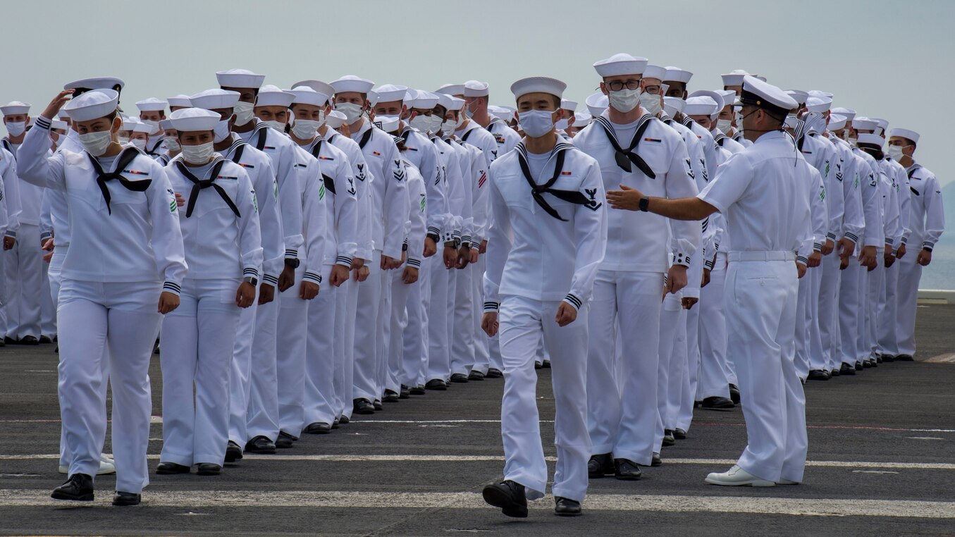 SAN DIEGO (Sept. 2, 2020) Sailors assigned to Nimitz-class nuclear aircraft carrier USS Carl Vinson (CVN 70) man the rails on the flight deck. Carl Vinson arrived in San Diego after conducting a homeport change from Bremerton, Wash. Carl Vinson recently completed a 17-month scheduled docking planned incremental availability (DPIA) and successful sea trials to test the recently upgraded ship’s systems. The DPIA included a system retrofit to accommodate Joint Strike Fighter mission capabilities to support F-35C Lightning II joint fighter squadrons. (U.S. Navy photo by Mass Communication Specialist 3rd Class Nicholas R. Carter)