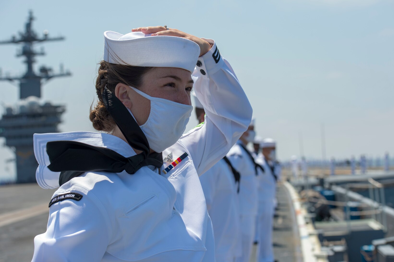 SAN DIEGO (Sept. 2, 2020) Aviation Boatswain’s Mate (Handling) Airman Alexis Bostard, a native of Cape May, N.J., assigned to Nimitz-class nuclear aircraft carrier USS Carl Vinson (CVN 70) participates in manning the rails on the flight deck of the ship. Carl Vinson arrived in San Diego after conducting a homeport change from Bremerton, Wash. Carl Vinson recently completed a 17-month scheduled docking planned incremental availability (DPIA) and successful sea trials to test the recently upgraded ship’s systems. The DPIA included a system retrofit to accommodate Joint Strike Fighter mission capabilities to support F-35C Lightning II joint fighter squadrons. (U.S. Navy photo by Mass Communication Specialist 3rd Class Nicholas R. Carter)