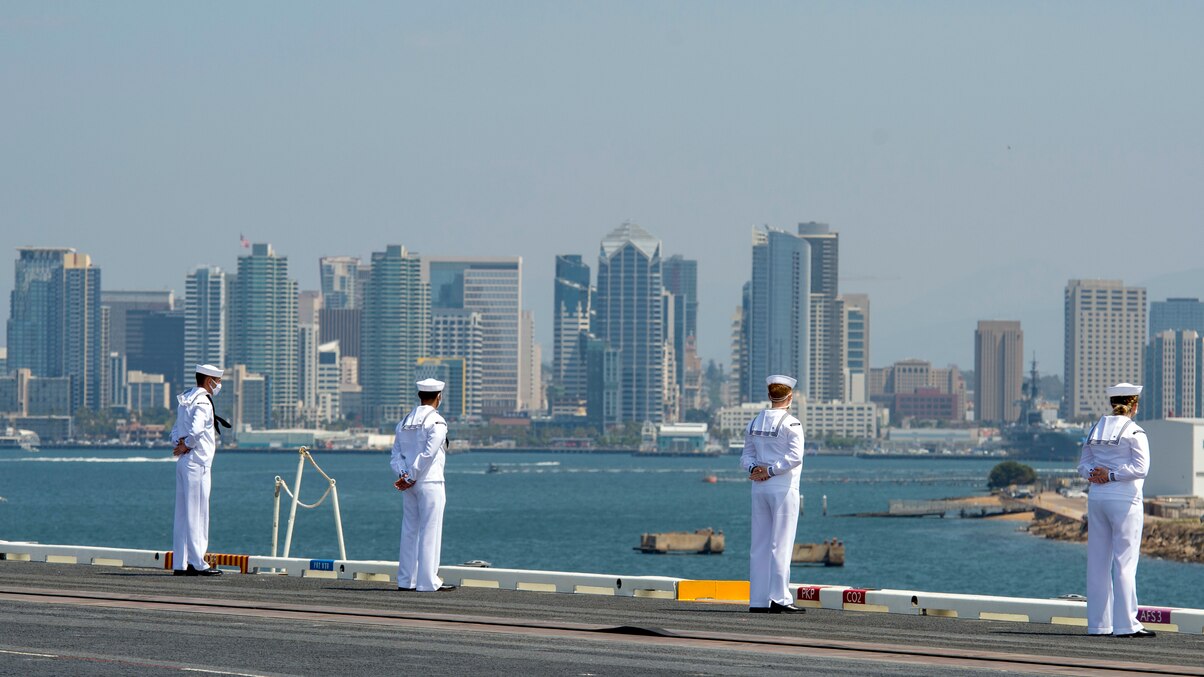 SAN DIEGO (Sept. 2, 2020) Sailors assigned to Nimitz class nuclear aircraft carrier USS Carl Vinson (CVN 70) man the rails on the flight deck of the ship. USS Carl Vinson (CVN 70) arrived in San Diego after conducting a homeport change from Bremerton, Washington. Carl Vinson recently completed a 17-month scheduled docking planned incremental availability (DPIA) and successful sea trials to test the recently upgraded ship’s systems. The DPIA included a system retrofit to accommodate Joint Strike Fighter mission capabilities to support F-35C Lightning II joint fighter squadrons. (U.S. Navy photo by Mass Communication Specialist 3rd Class Nicholas Carter/ Released)