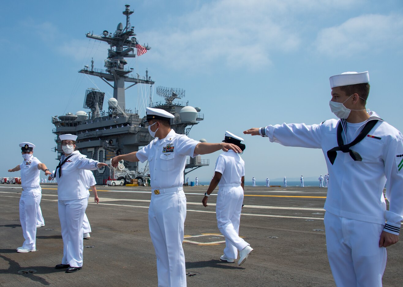 SAN DIEGO (Sept. 2, 2020) Sailors assigned to Nimitz class nuclear aircraft carrier USS Carl Vinson (CVN 70) space themselves out to man the rails on the flight deck of the ship. Carl Vinson arrived in San Diego after conducting a homeport change from Bremerton, Washington. Carl Vinson recently completed a 17-month scheduled docking planned incremental availability (DPIA) and successful sea trials to test the recently upgraded ship’s systems. The DPIA included a system retrofit to accommodate Joint Strike Fighter mission capabilities to support F-35C Lightning II joint fighter squadrons. (U.S. Navy photo by Mass Communication Specialist 3rd Class Erin Zorich)