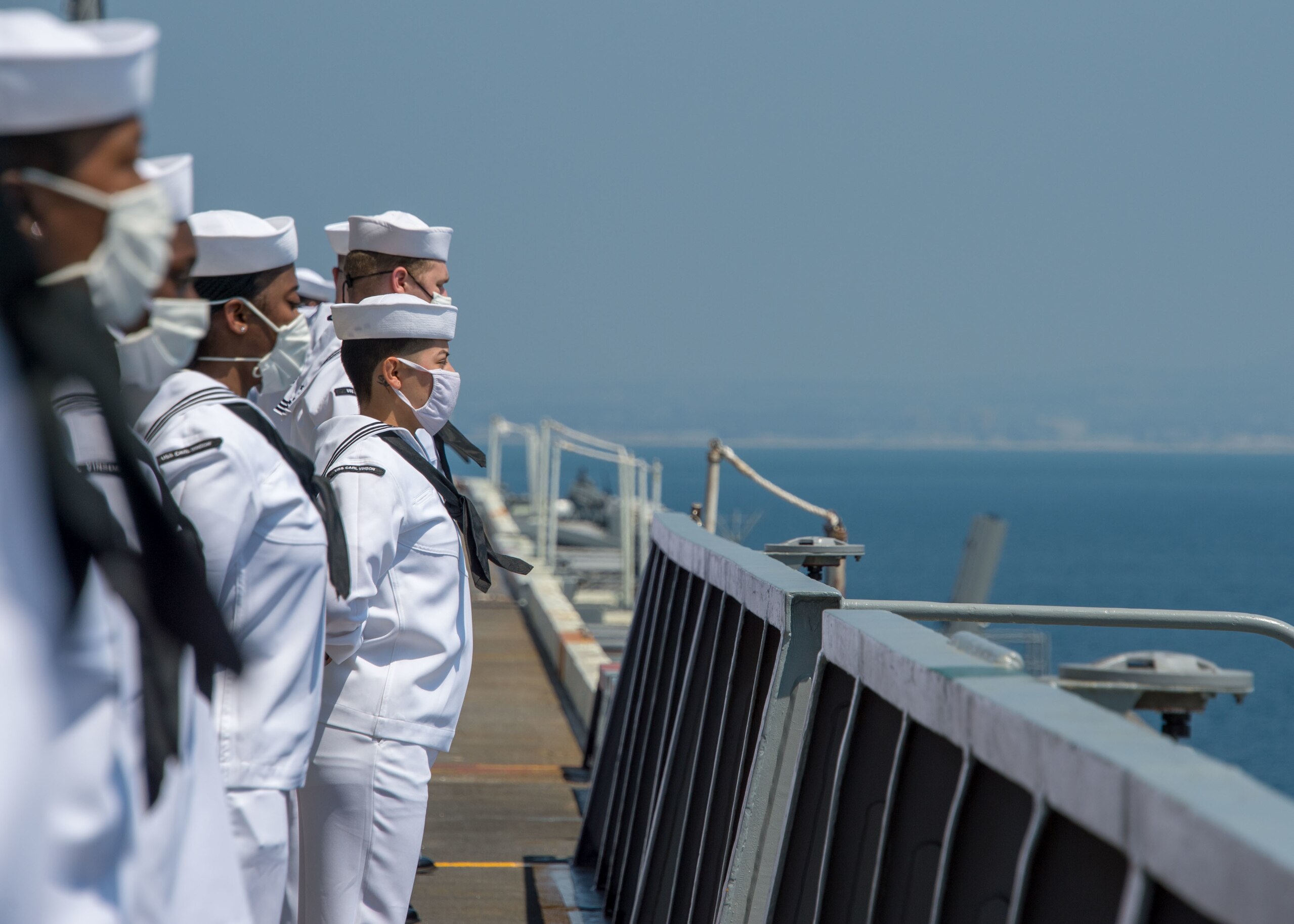SAN DIEGO (Sept. 2, 2020) Sailors assigned to Nimitz class nuclear aircraft carrier USS Carl Vinson (CVN 70) man the rails on the flight deck of the ship. Carl Vinson arrived in San Diego after conducting a homeport change from Bremerton, Washington. Carl Vinson recently completed a 17-month scheduled docking planned incremental availability (DPIA) and successful sea trials to test the recently upgraded ship’s systems. The DPIA included a system retrofit to accommodate Joint Strike Fighter mission capabilities to support F-35C Lightning II joint fighter squadrons. (U.S. Navy photo by Mass Communication Specialist 3rd Class Erin Zorich)